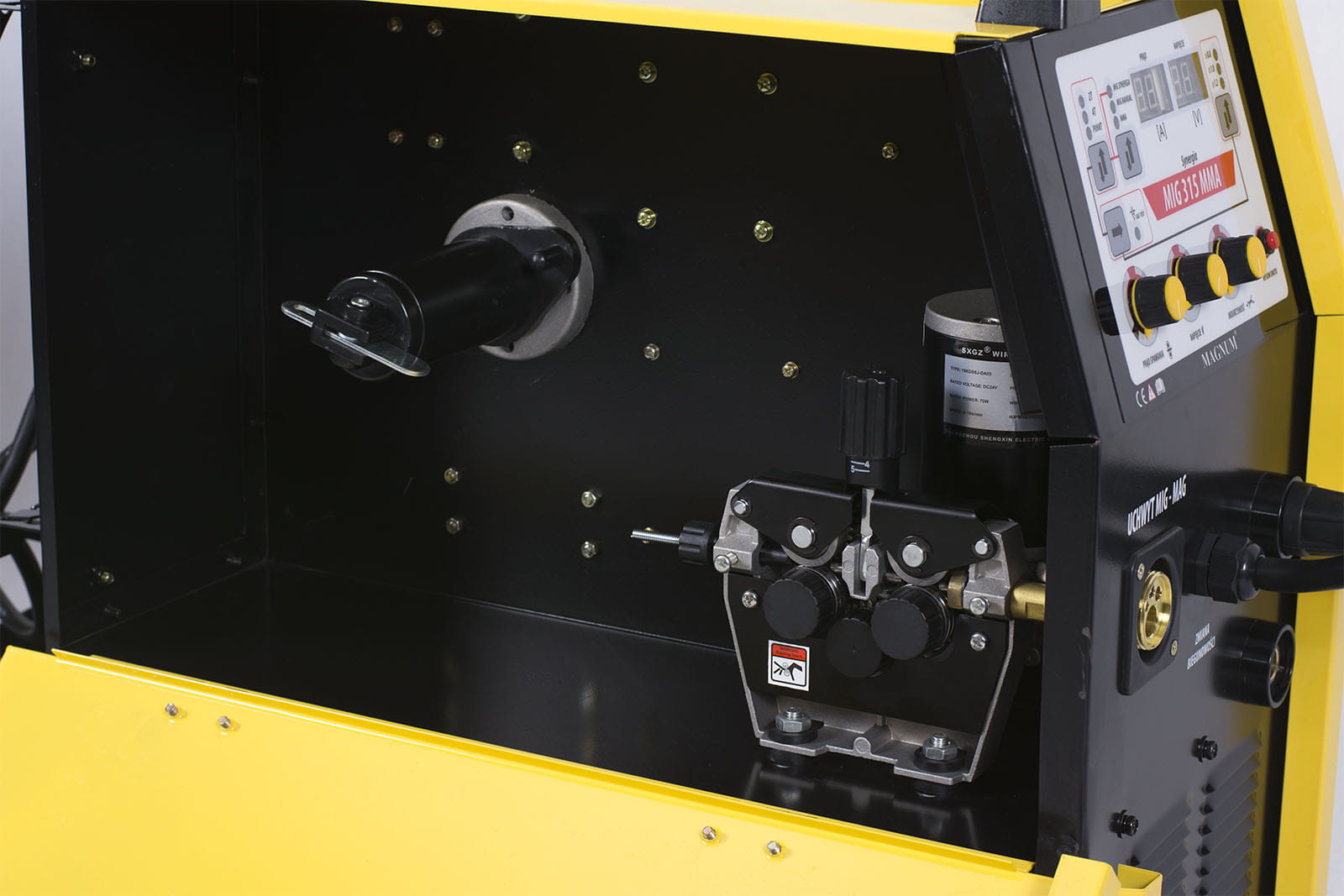 W urządzeniu MIG 315 MMA Synergia zastosowano podajnik drutu z 4-rolkowych mechanizmem. Dwie rolki prowadzące i dwie rolki dociskowe, tworzą znakomity zespół.