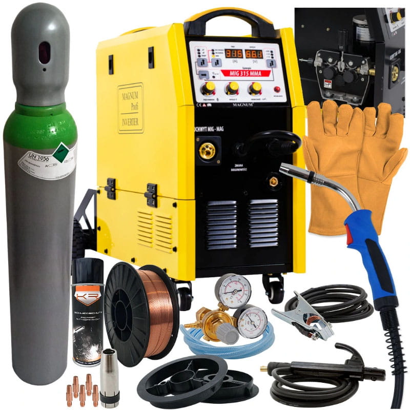 Profesjonalny półautomat spawalniczy Magnum MIG 315 MMA Synergia to rewelacyjny MIG 2w1 na duże szpule zasilany z sieci trójfazowej 400V. Jest to jeden z najnowszym modeli tego producenta, wykonany w technologii inwertorowej IGBT.