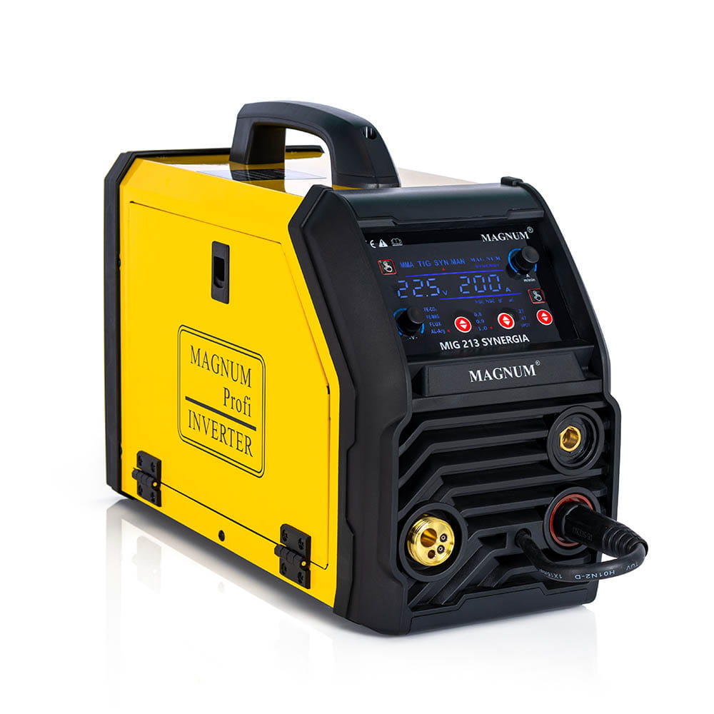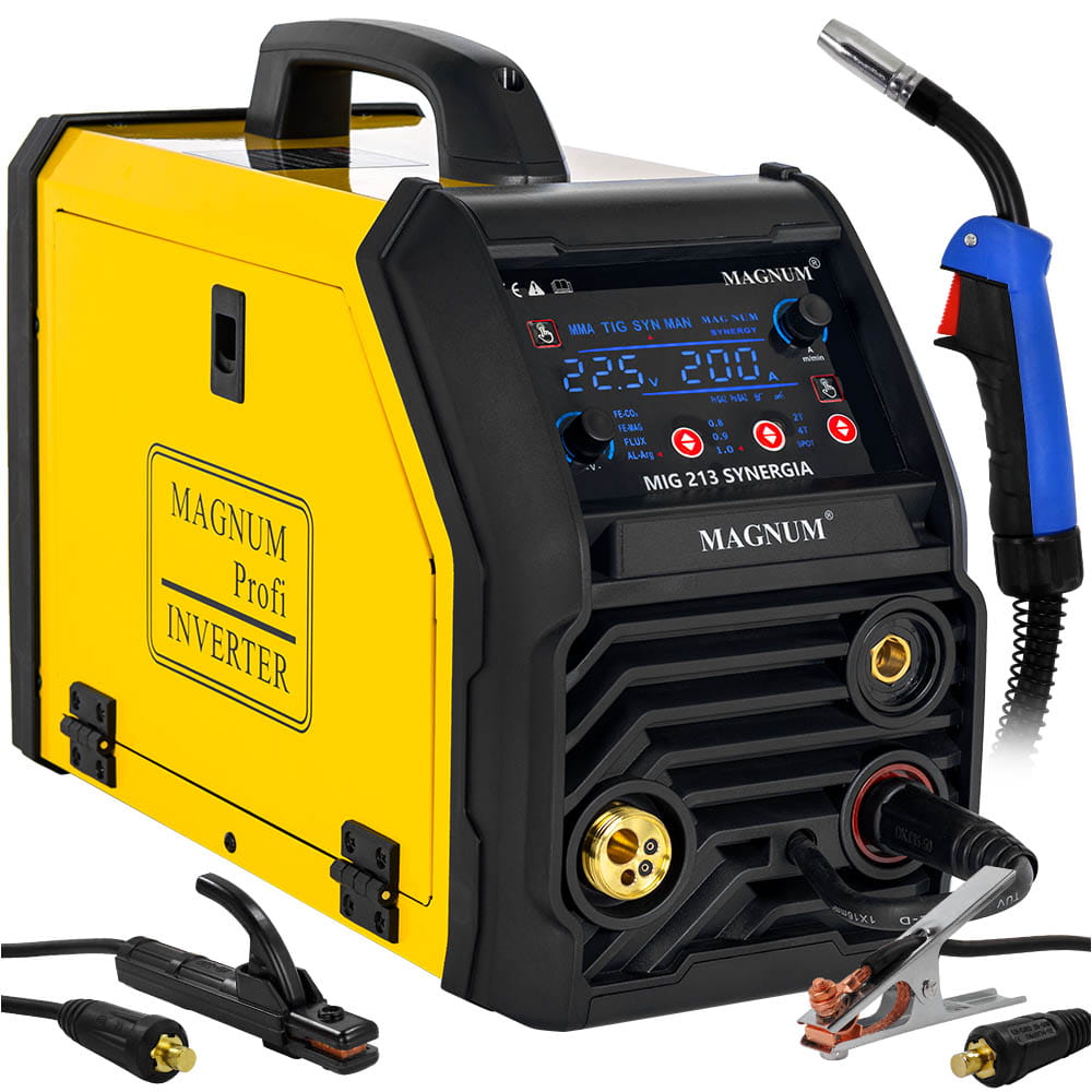 SPAWARKA MAGNUM MIG 213 SYNERGIAMIG 213 SYNERGIA to zaawansowane technologicznie urządzenie spawalnicze, umożliwiające spawanie metodami MIG-MAG, MMA oraz TIG LIFT. Doskonałe zarówno dla profesjonalistów, jak i amatorów, sprawdza się idealnie w warsztatach samochodowych, ślusarskich, naprawczych, przemysłowych oraz przydomowych. Urządzenie zaprojektowano do ręcznego, elektrycznego spawania różnych materiałów, takich jak: